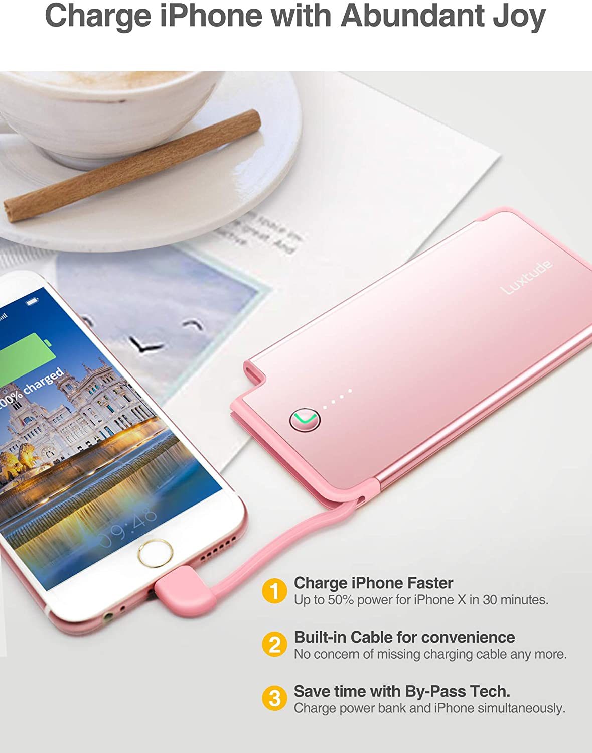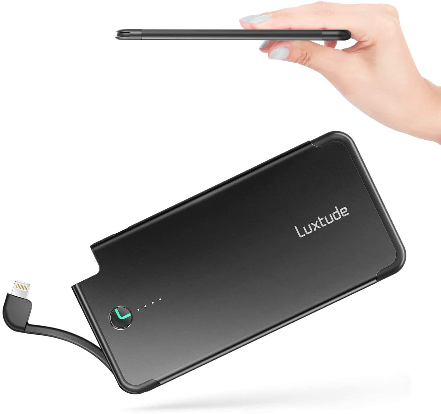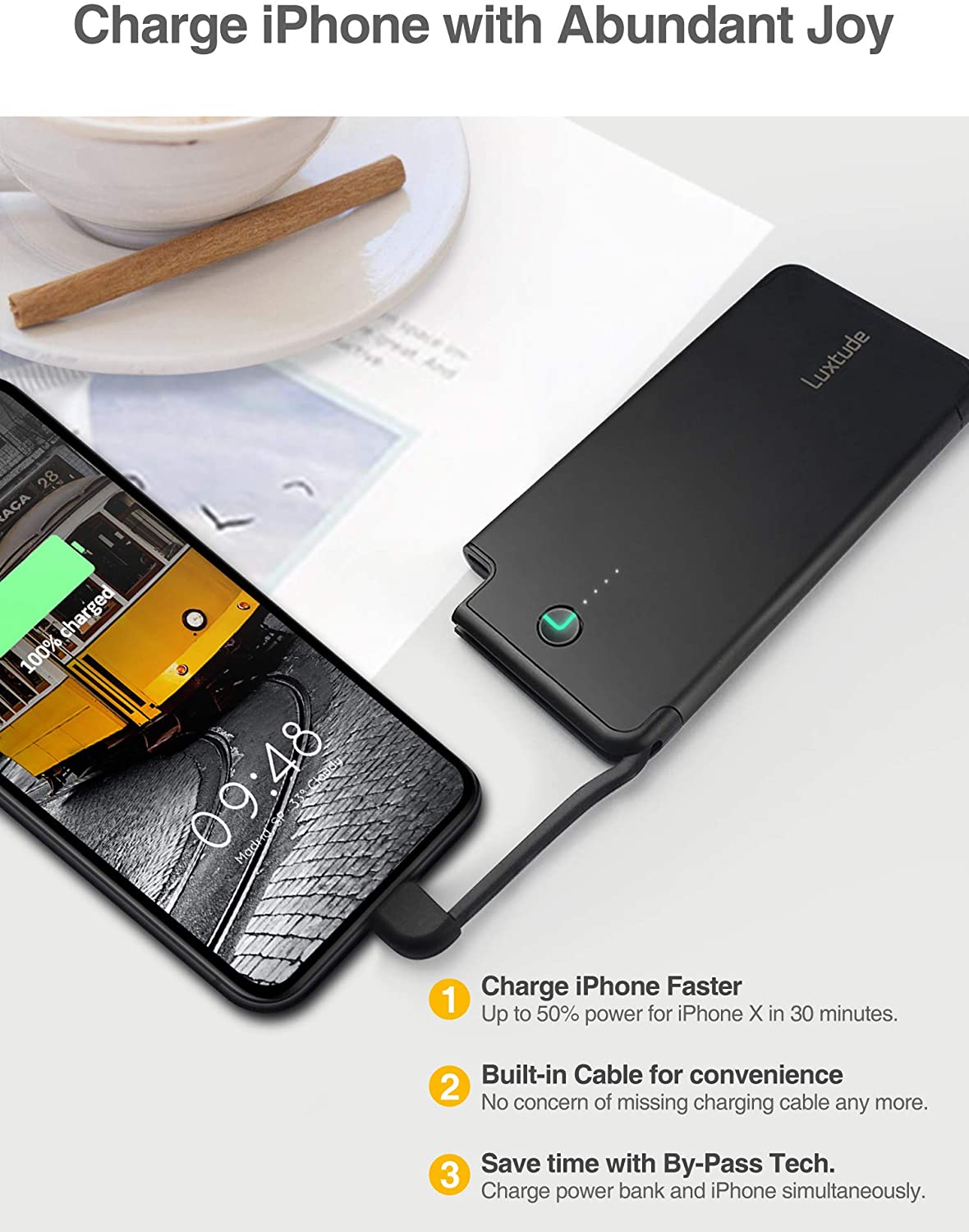 - ✔ POWER IPHONE WONDERFULLY: (1) HIGH CAPACITY. It can charge iPhones 1.1-1.8 times, great for full day travel or backup supply. (2)FAST CHARGING. Twice as fast as iPhone original wall charger & original cable. (3)CONVENIENT. With built in cable, no more missing charging cord. (4)TIME SAVING. With our by-pass tech, you can charge iPhone & power bank simultaneously.