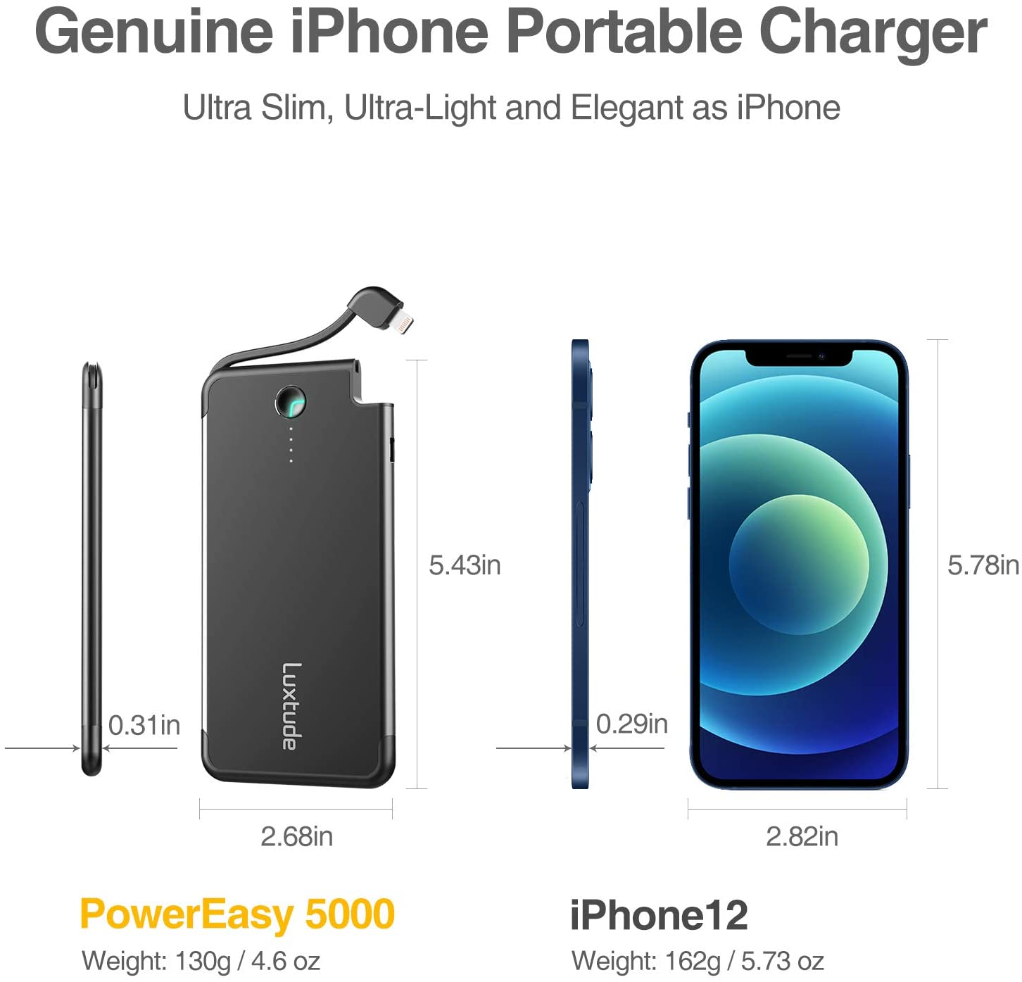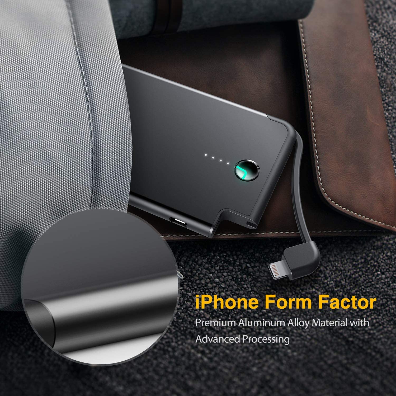 - ✔ IPHONE FORM FACTOR: Perfect portable iPhone charger, 0.31” ultra slim, 2.68” x 5.43” pocket sized small, 4.6 oz ultra-light, premium aluminum alloy case and careful fabrication, make it as elegant as iPhone even like iPhone.