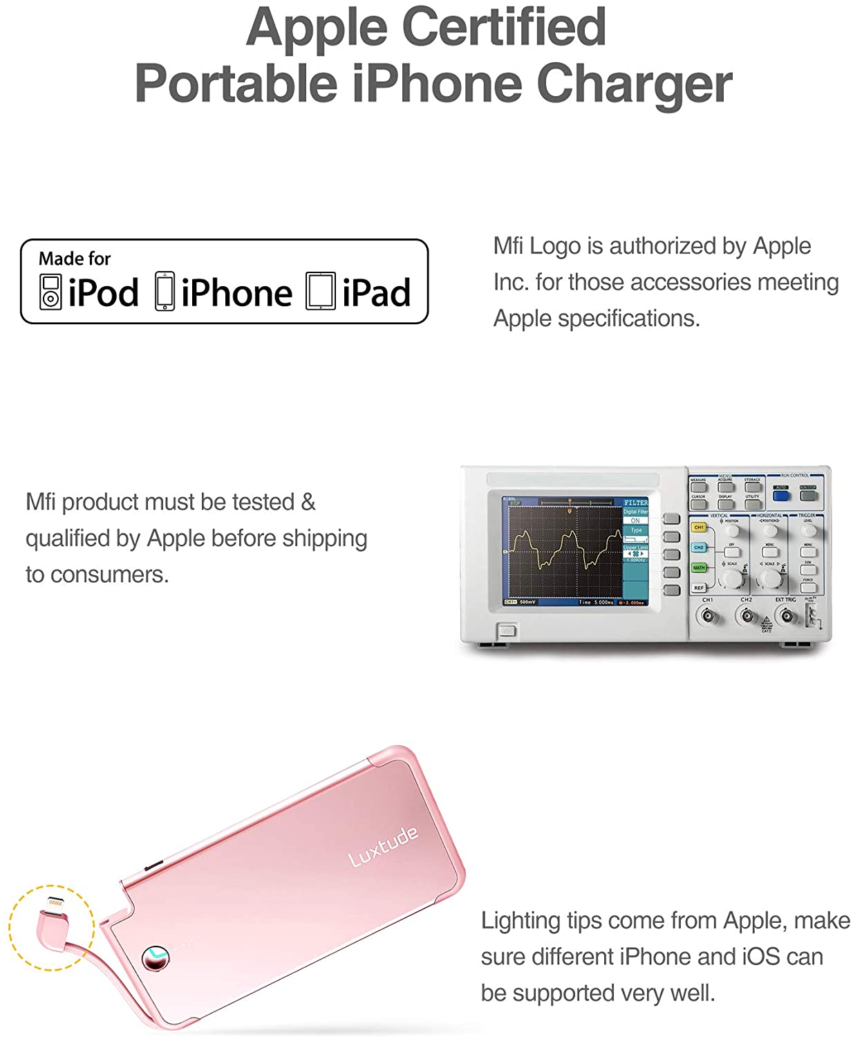 - ✔ SAFER PORTABLE PHONE CHARGER: Equipped with UL certified Li-Polymer battery pack as iPhone and qualified by Apple, it’s the iPhone portable charger to ensure safety all the time.